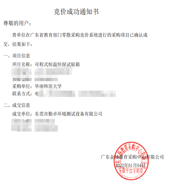 華南師范大學(xué)公開競(jìng)標(biāo)恒可程式溫恒濕試驗(yàn)箱項(xiàng)目,經(jīng)過學(xué)校領(lǐng)導(dǎo)在多家廠家中對(duì)比方案細(xì)節(jié)最終確定我司中標(biāo)。在2022年1月4日通知我司中標(biāo)成功通知書以及簽訂合同,也十分感謝學(xué)校領(lǐng)導(dǎo)在開年第一天上班第一時(shí)間給到如此重要的喜訊。感謝學(xué)校領(lǐng)導(dǎo)選購勤卓品牌可程式恒溫恒濕試驗(yàn)箱,我司如實(shí)把控品質(zhì)保障出廠精品.